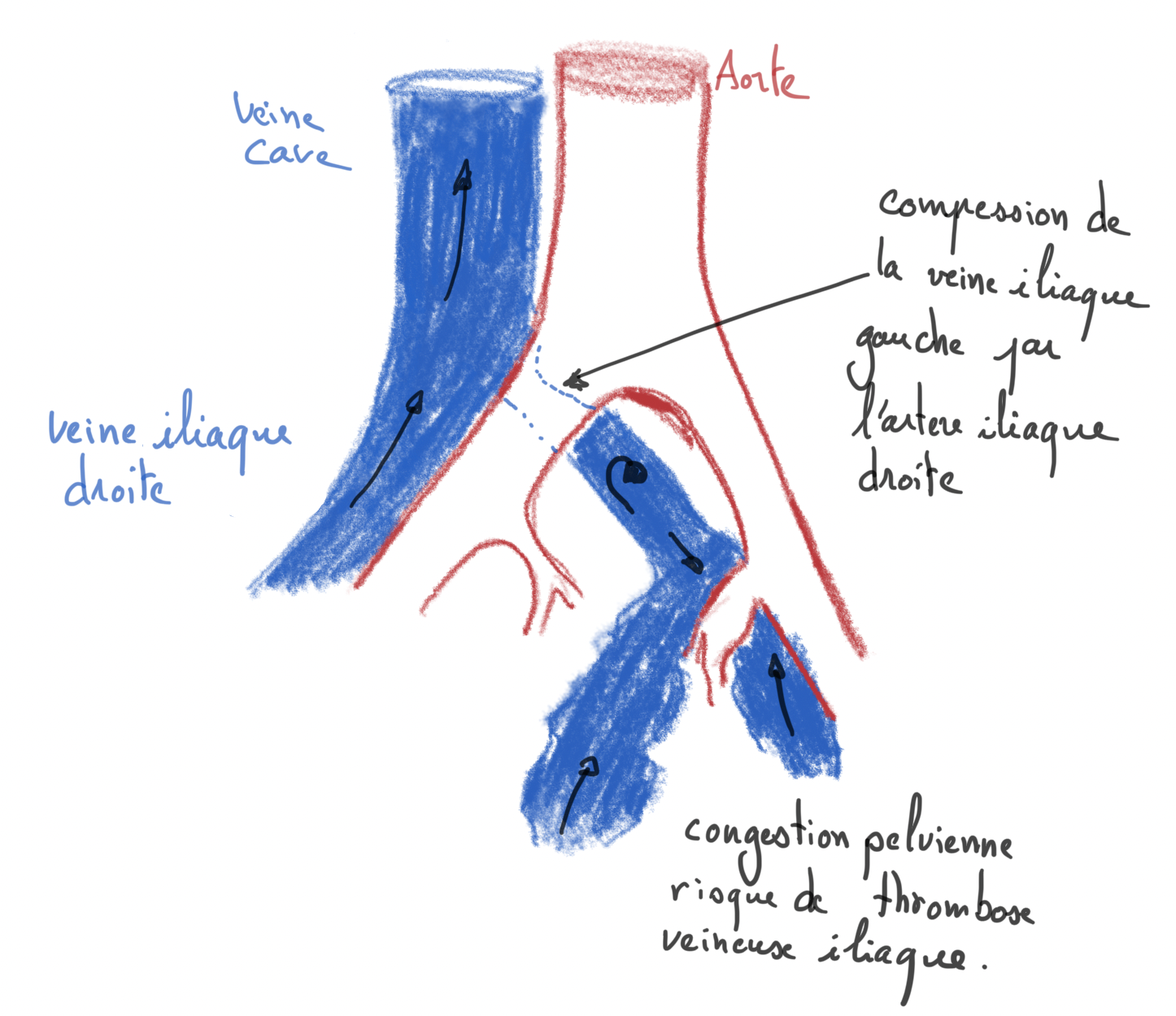 - Conflit vasculaire artério‑veineux iliaque (compression veine iliaque gauche par artère iliaque droite).(1)(2)